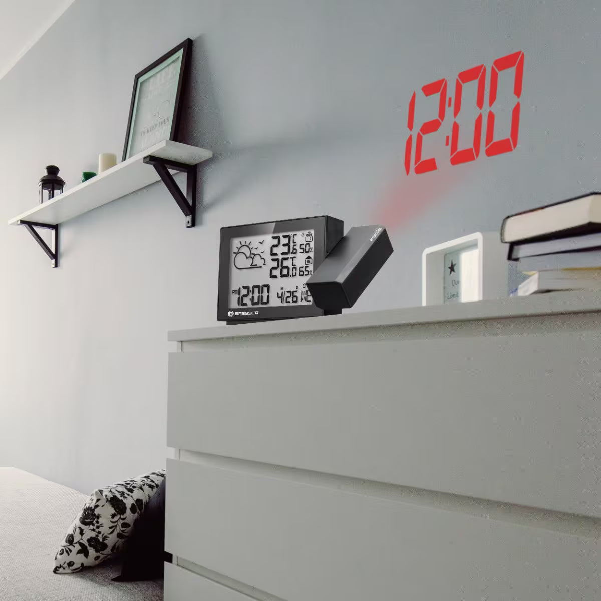 - Weather station with projection of time and weather forecast symbol on ceiling/wall.